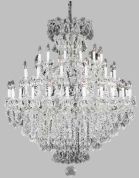 SWAROVSKI CRYSTAL TRIMMED CHANDELIER. A great European tradition. Nothing was ever quite so elegant as the fine crystal chandeliers that lent sparkle to brilliant evenings in palaces and manor houses across Europe. This beautiful version from the Maria Theresa collection is decorated with various hand-cut and polished SWAROVSKI crystals that capture and reflect the light of candle bulbs resting in a scalloped bobache. The timeless elegance of these chandeliers is sure to lend a special atmosphere in every home Size: W.52" H.60" 36 LIGHTS