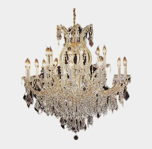 Maria Theresa CHANDELIER DRESSED WITH SWAROVSKI CRYSTAL. A great European tradition. Nothing was ever quite so elegant as the fine crystal chandeliers that lent sparkle to brilliant evenings in palaces and manor houses across Europe. This beautiful version from the Maria Theresa collection is dressed with SWAROVSKI crystal that capture and reflect the light of candle bulbs resting in a scalloped bobache. The timeless elegance of these chandeliers is sure to lend a special atmosphere in every home. Please note this item requires assembly. This item comes with 18 inches of chain. SIZE: HT 38 X WD 37 LIGHTS: 16 LIGHTS